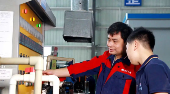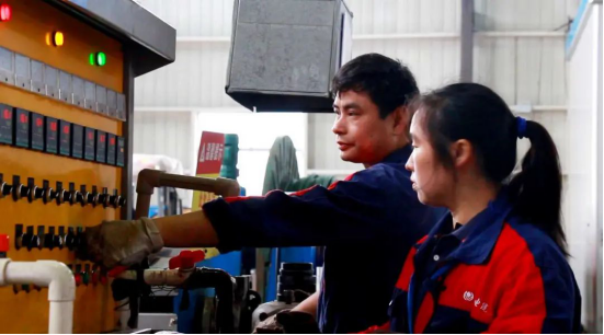 ▲刘学文正在给同事演示机器操作