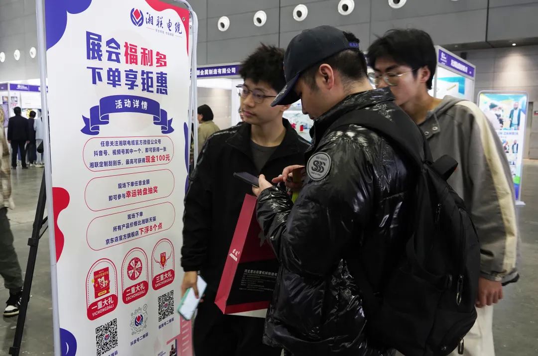 本次展览,湘联电缆展台不仅在服务上下功夫,更是在价格与活动上集中发力,为本次展会专项申请了价格优惠和商务笔记本、养生壶、电工钳等多重好礼,推出下单抽奖等消费福利,为客户带去切实的下单购线利益。