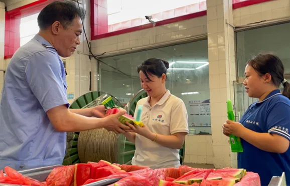 炎热的午后,满载西瓜和冰棒的小推车穿梭于湘联电缆各个岗位一线,一块块红彤彤的西瓜和一支支冰爽的冰棒顺利分发到员工手中,大家脸上露出了灿烂的笑容,欢声笑语回荡在各个角落。