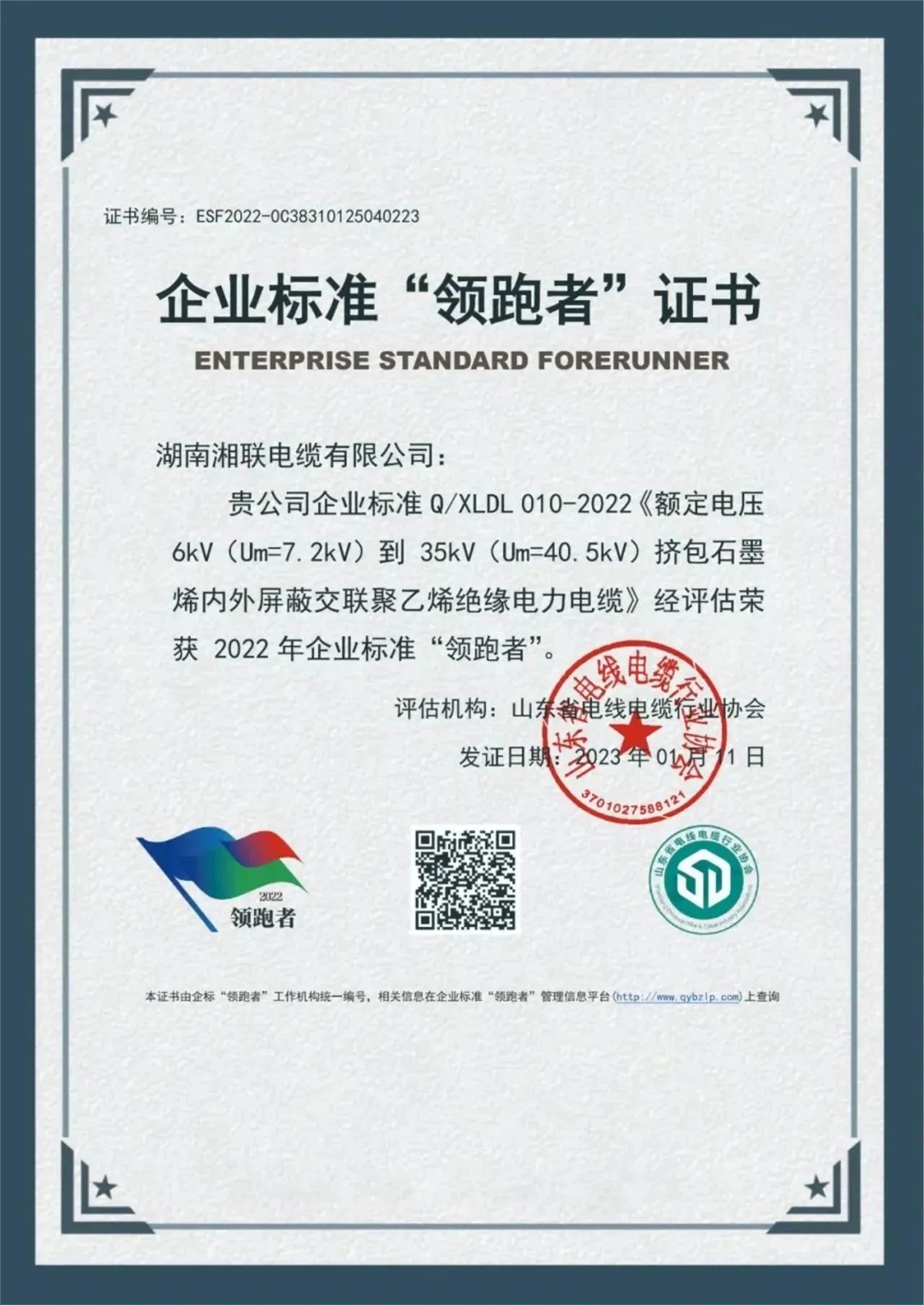 自成立以来,湘联电缆以“质量是发展的基石,是客户信任的唯一理由”为指导,将产品质量视为企业生命线,不断引进国内一流的电线电缆生产和检测设备,以科学的经营管理理念,组建实力雄厚的技术研发和企业管理团队,建立高标准质量管理体系,对生产全过程实现智能化数字化管理,公司产品先后通过国家强制性产品认证(CCC认证),荣获企业标准“领跑者”等荣誉称号,获得用户的广泛认可。
