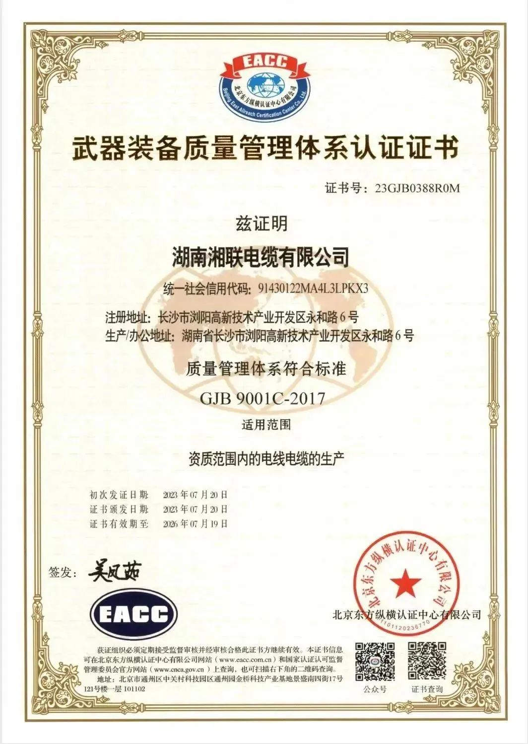 此次通过国军标质量管理体系认证,表明湘联电缆的质量管理体系符合武器装备质量管理体系的标准及相关要求,具备军品研发、生产和服务的质量管理能力。未来,湘联电缆将注重完善质量管理体系,以保持和提高产品的质量和性能,以寻求更广阔的发展前景,为国家安全事业做出更大的贡献。