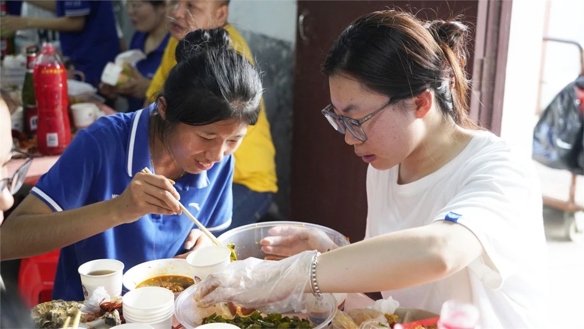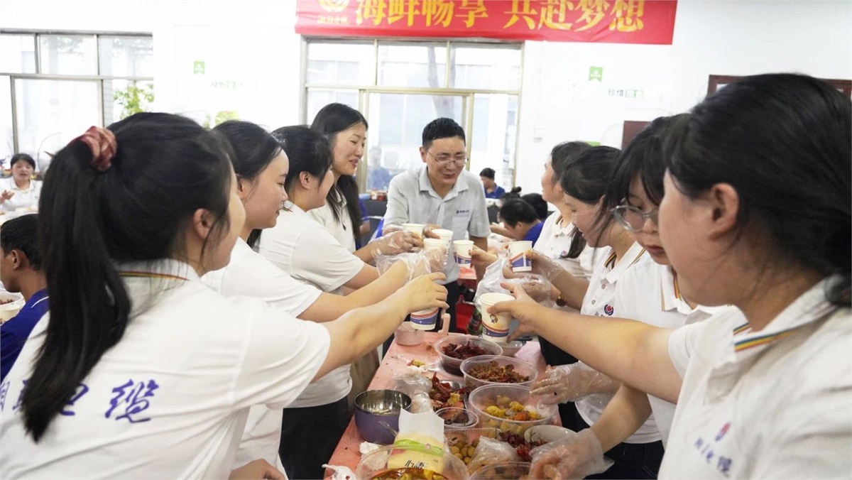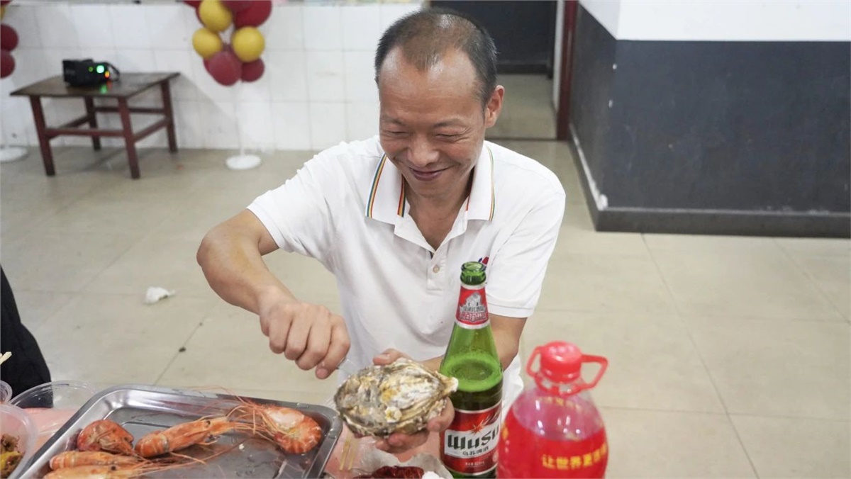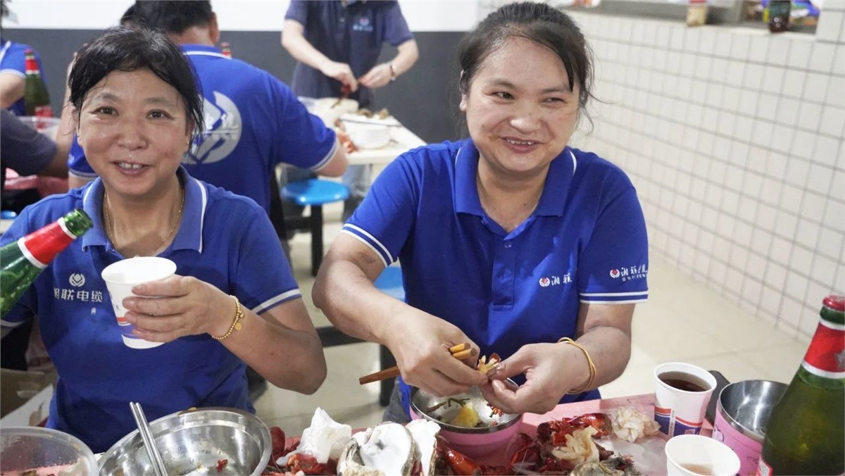 踏入餐厅,映入眼帘的是一盘盘美味的龙虾、生蚝和飘香四溢的热卤、精致可口的小菜,还有清热解渴的西瓜、冰镇凉茶等。大家欢聚员工餐厅,围桌而坐,欢声笑语不断,鲜嫩可口的海鲜在味蕾上绽放,一次次举杯饱含喜乐、一声声欢笑传递幸福。