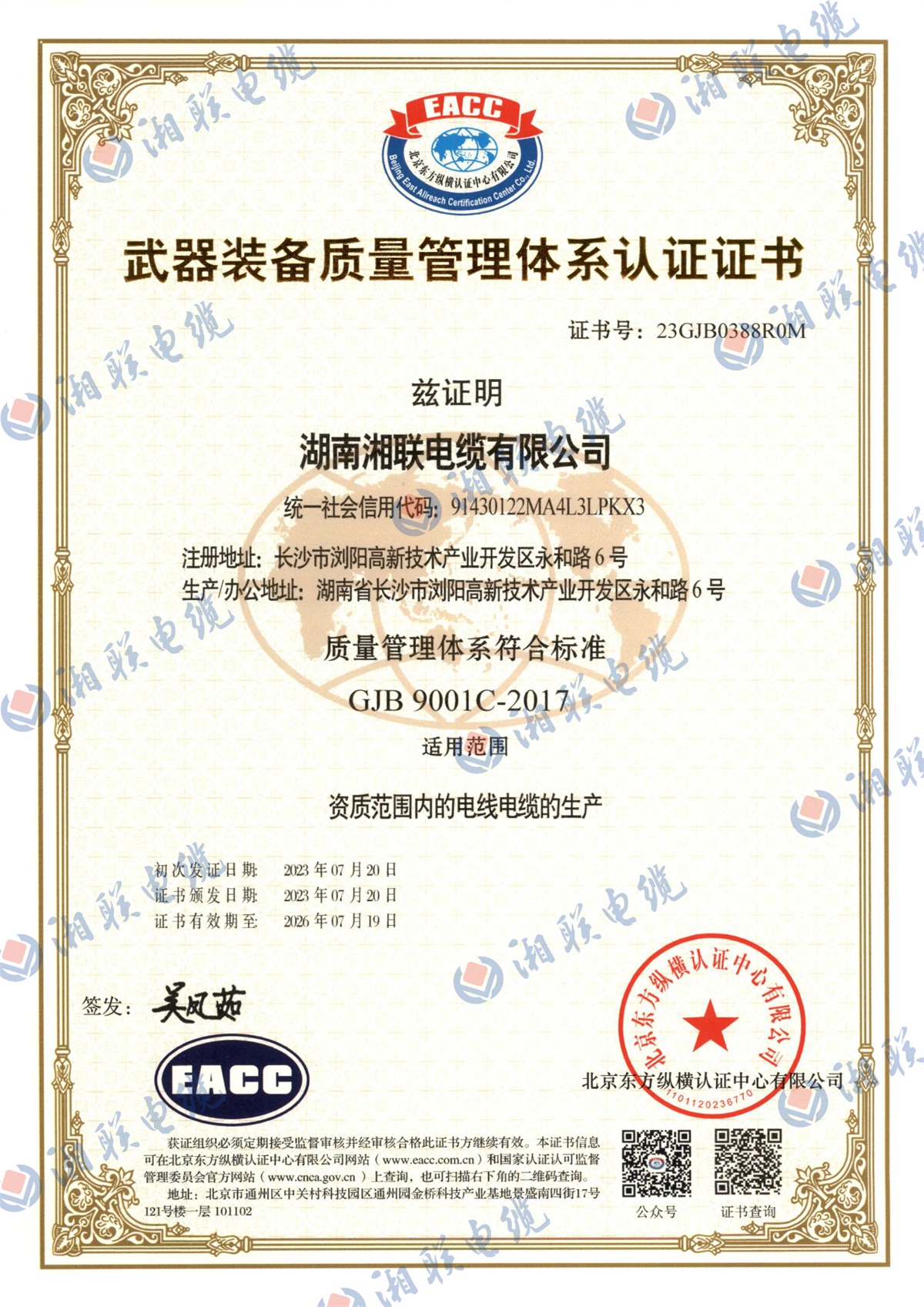 7月,湘联电缆顺利通过国军标质量管理体系认证,获得《武器装备质量管理体系认证证书》。