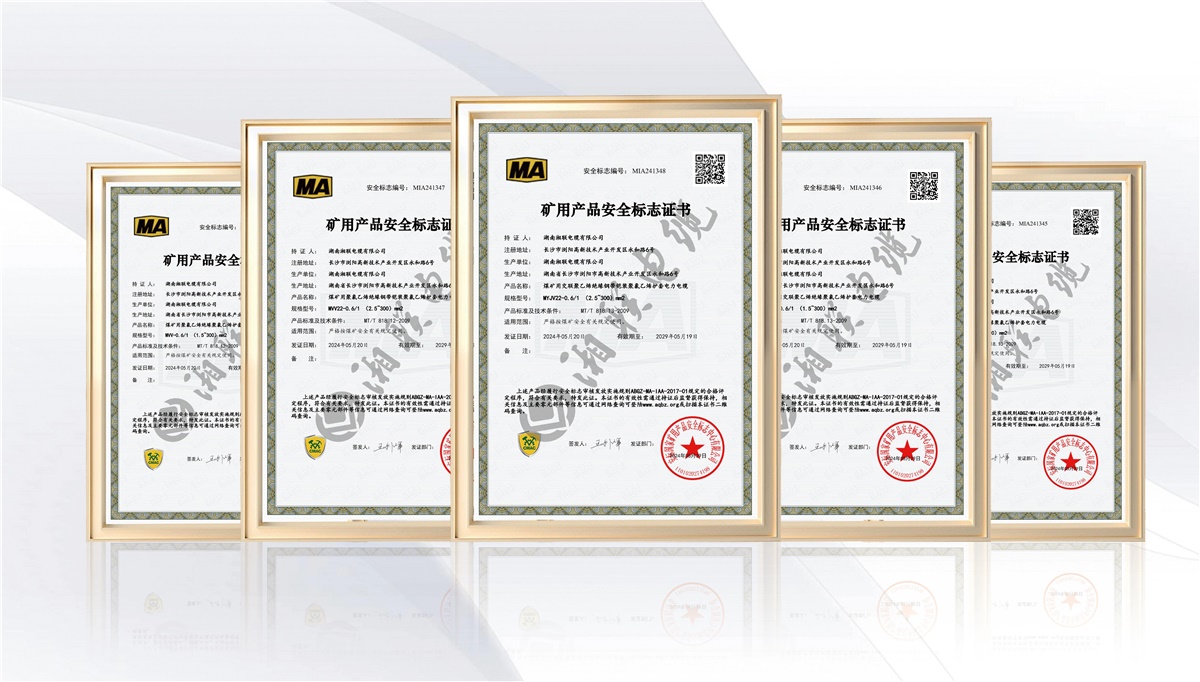 矿用电缆必须严格遵守国家及行业双重标准,需按照GB/T 12972《矿用橡套软电缆》、MT818-2009《煤矿用阻燃电缆》生产,都应经过安标国家矿用产品安全标志中心颁发矿用产品安全标志证书,才能向市场出售 。近期,湘联电缆的MVV-0.6/1(1.5~300)mm²煤矿用聚氯乙烯绝缘聚氯乙烯护套电力电缆、MYJV-8.7/10(25~300)mm²煤矿用交联聚乙烯绝缘聚氯乙烯护套等6款电力电缆成功取得矿用产品安全标志证书,其产品在阻燃、耐压、抗拉强度等方面均达到行业标准。