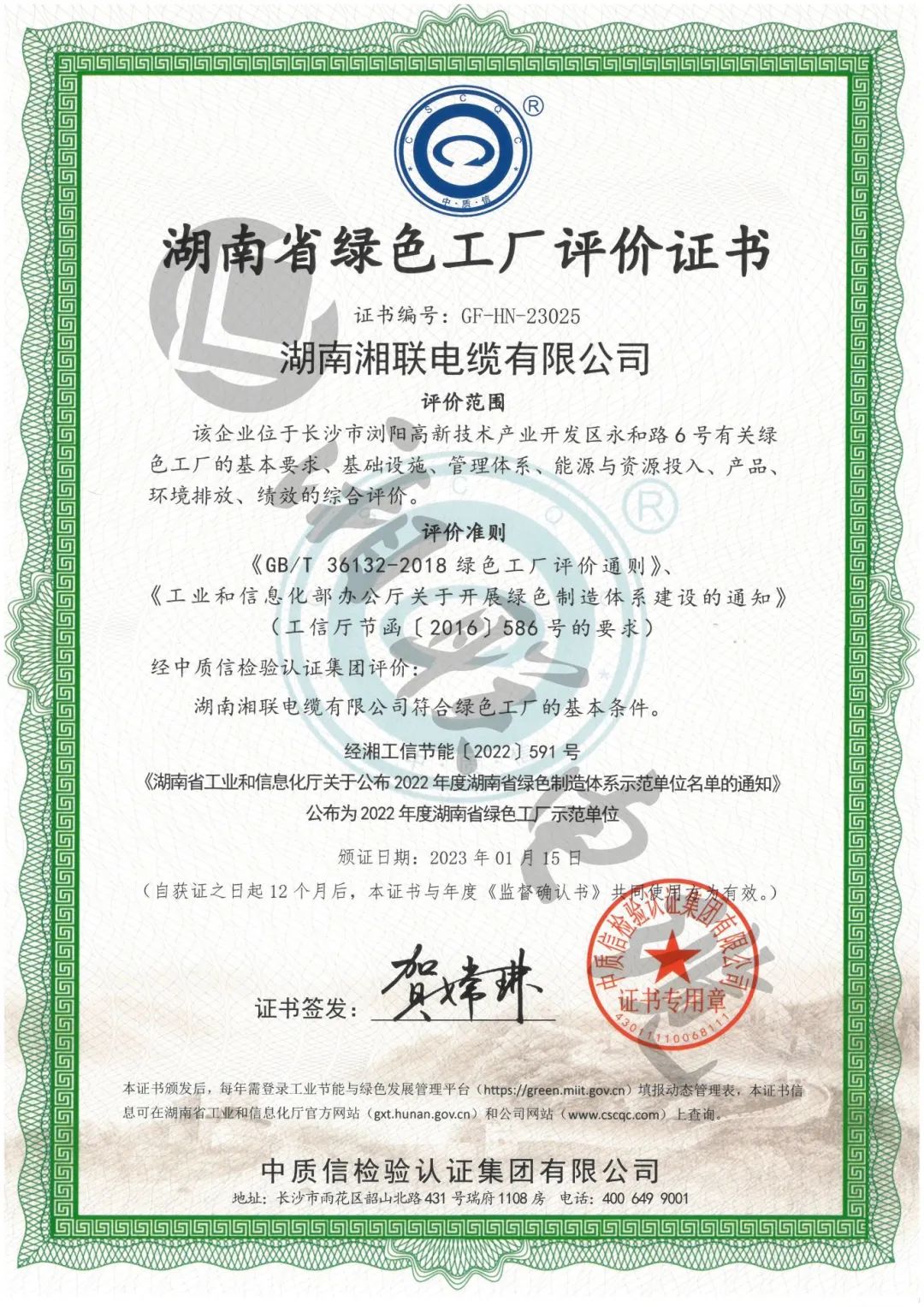 在这样的时代背景下,湘联电缆积极践行“绿水青山就是金山银山”的发展理念,协同推进减污、降碳、扩绿、增长,坚持生态优先、节约集约、绿色低碳的发展道路,将绿色理念贯穿于全产业、全链条和全过程,并于2023年成功入选湖南省绿色工厂示范单位。