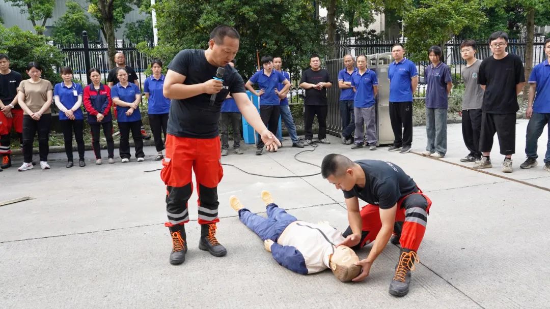 为了应对生产过程中可能发生的触电、漏电等意外伤害事故,本次消防演练还安排了触电应急演练,消防教员从截断电源、脱离电源、心肺复苏急救三个方面为大家培训了科学有效的应对方法,实用性强,真正提升了大家对触电等事故的应急能力。